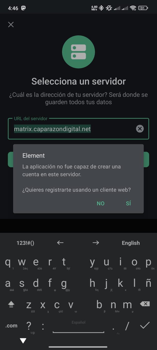 Error al intentar crear cuenta nueva desde las apps móviles / probado en android con Element y Element X.